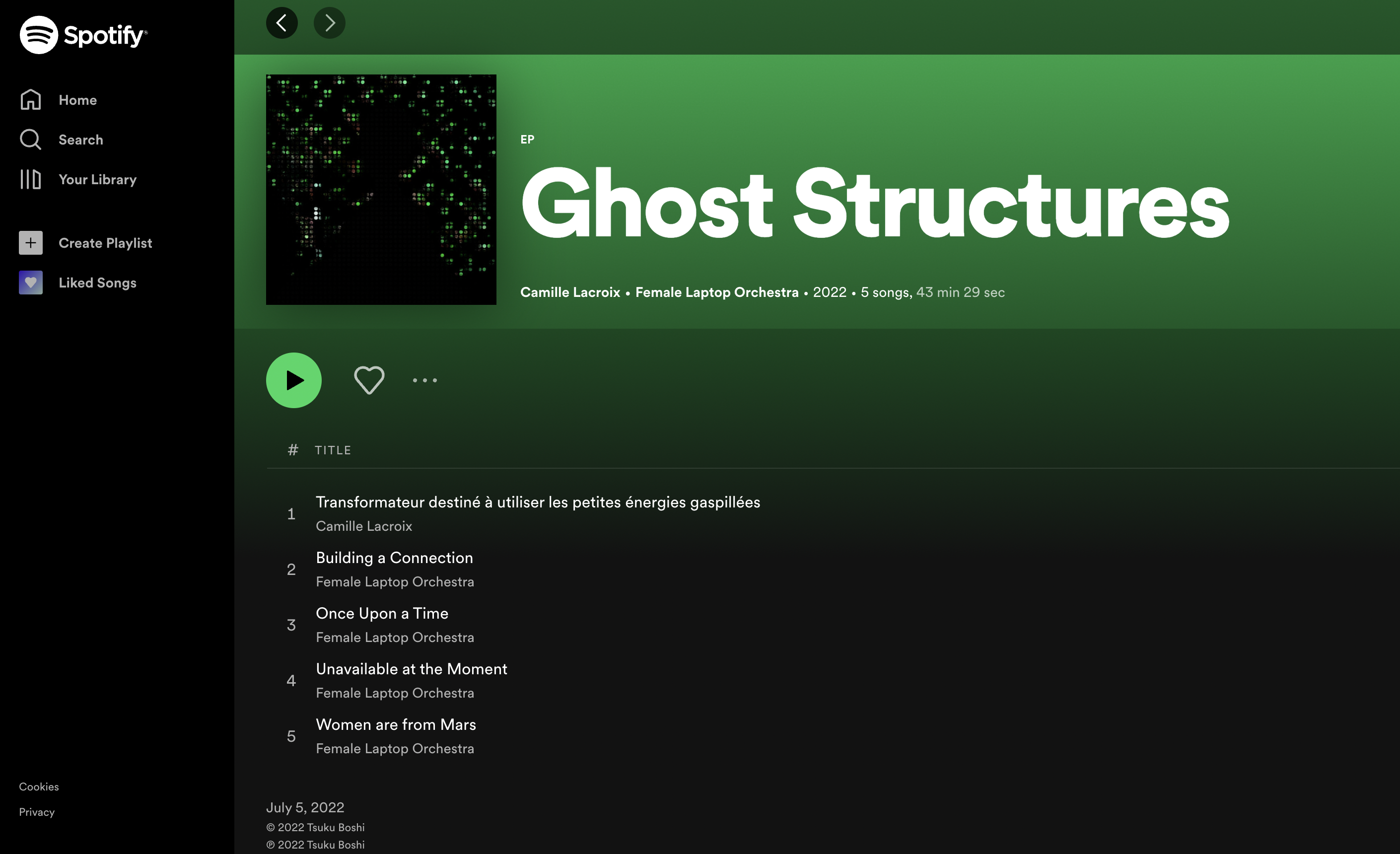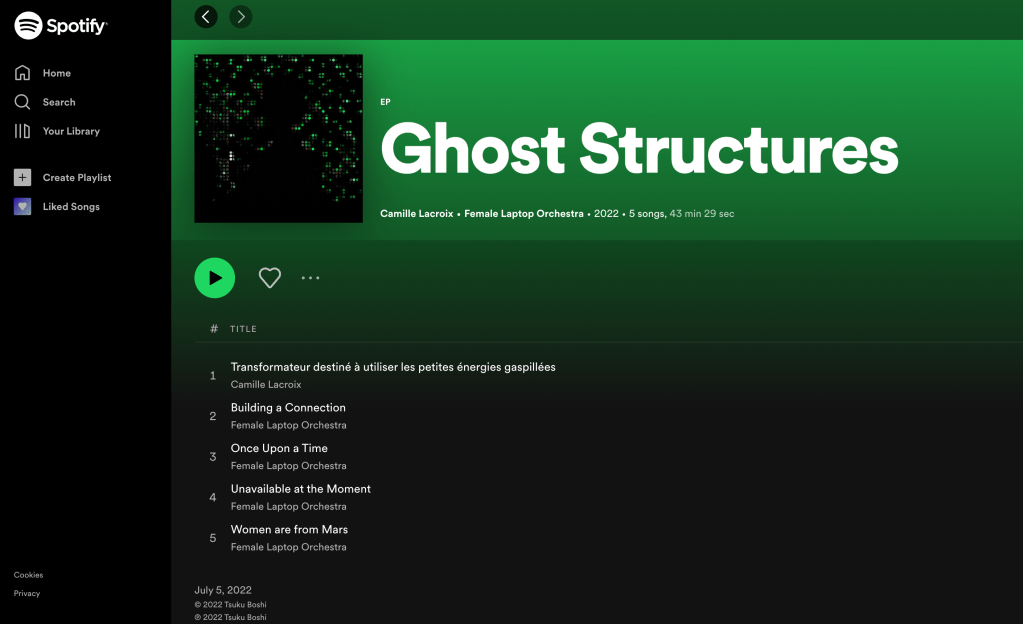 In 2021, as part of the ]FairTsuku[ project, presenting female and non-binary composers from various backgrounds, the Fair_Play network (Vienna, Austria) and Tsuku Boshi Records (Paris, France) invited Female Laptop Orchestra (FLO) and Camille Lacroix to produce music for their upcoming EP, ‘Ghost Structures‘.