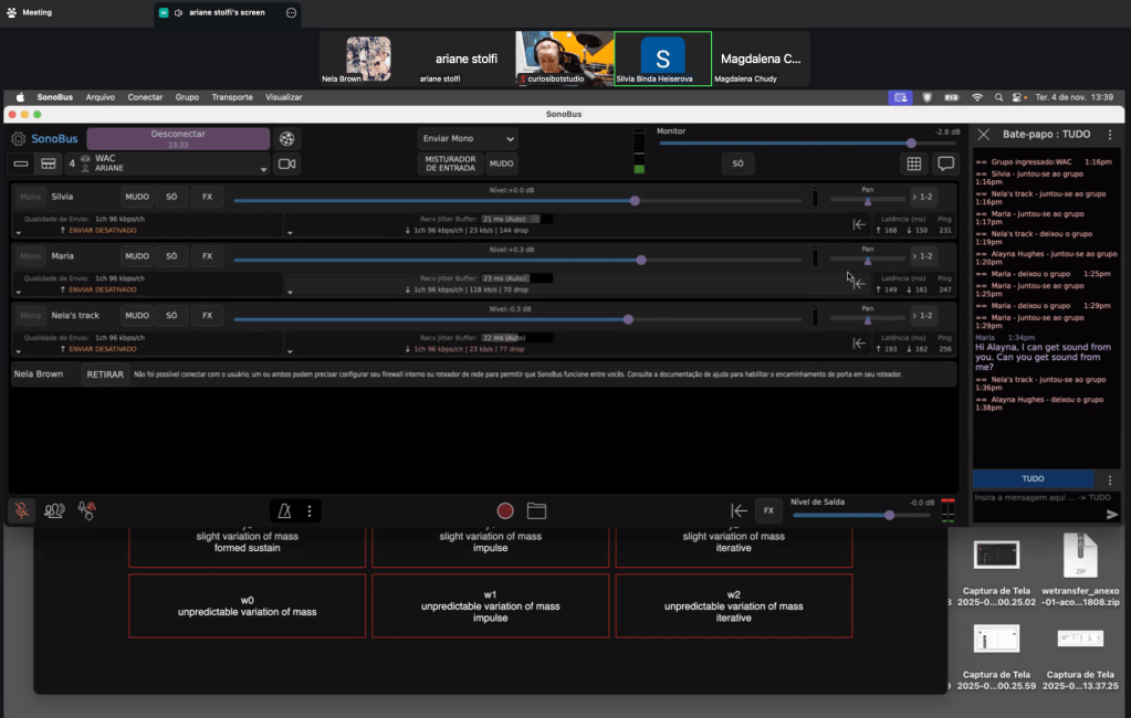 During FLO rehearsals, we discussed Plan A, in which Magda would use one computer to play Nela’s soundscape composition and grab the soundwalk stream sent by Sonia from Melbourne, and stream her processed cello from the other. Maria and Alayna would join the SonoBus from Palermo and Valencia, and Nela, Ariane and Silvia would join from IRCAM.