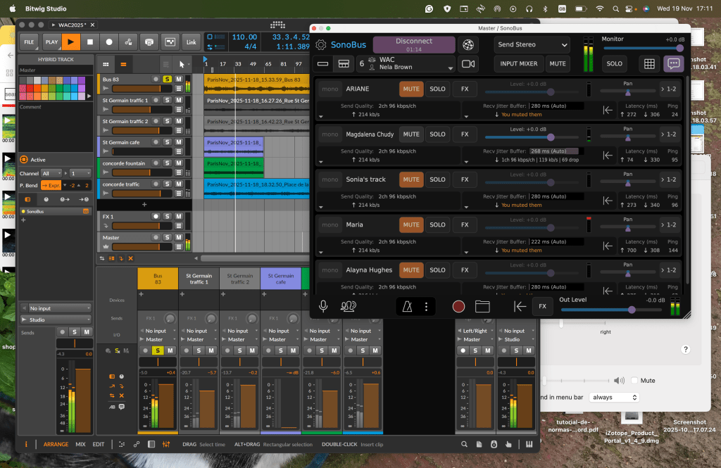 - The technical team (coordinated by Benjamin Matuszewski), who did their best to help us go from plan A to plan B when the unexpected technical issues with the SonoBus servers appeared out of the blue