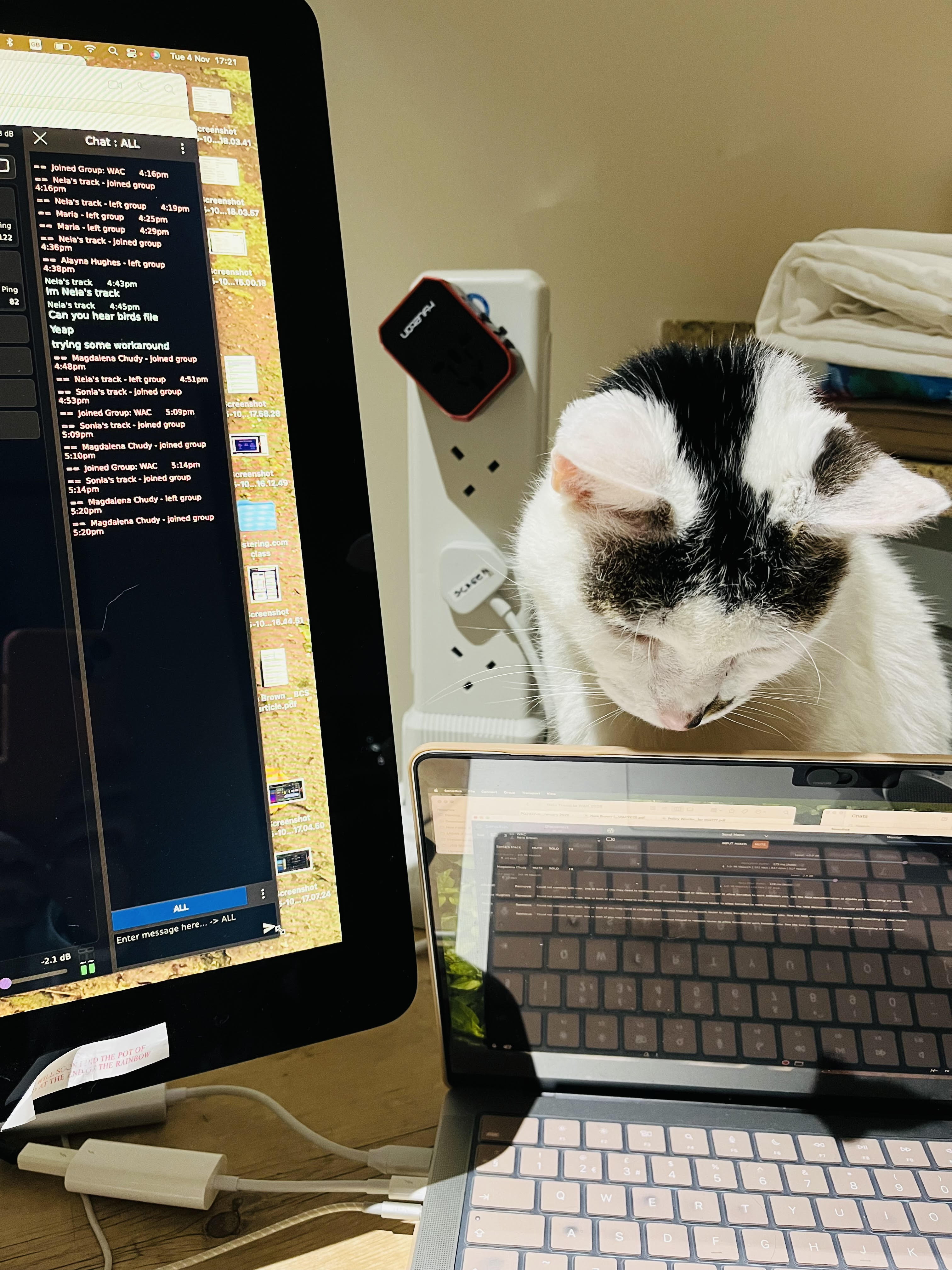 In the afternoon, Suzanne Saint-Cast (from the WAC2025 committee) moderated an interesting roundtable discussion on diversity in the Web Audio community. Nela and Ariane participated in person, whilst Silvia recorded a video message as she had to fly off earlier that day. The other participants included: Panagiota Anastasopoulou (also known as Penny), who is currently doing her PhD at the Music Technology Group (MTG) at the Universitat Pompeu Fabra in Barcelona, and hangs out with the freesound folks (including the lovely Frédéric Font) and who was able to moderate the soundscape Sonia recorded in Melbourne and uploaded to freesound.org, so Nela was able to use it with playsound.space during the performance (THANK YOU PENNY!).