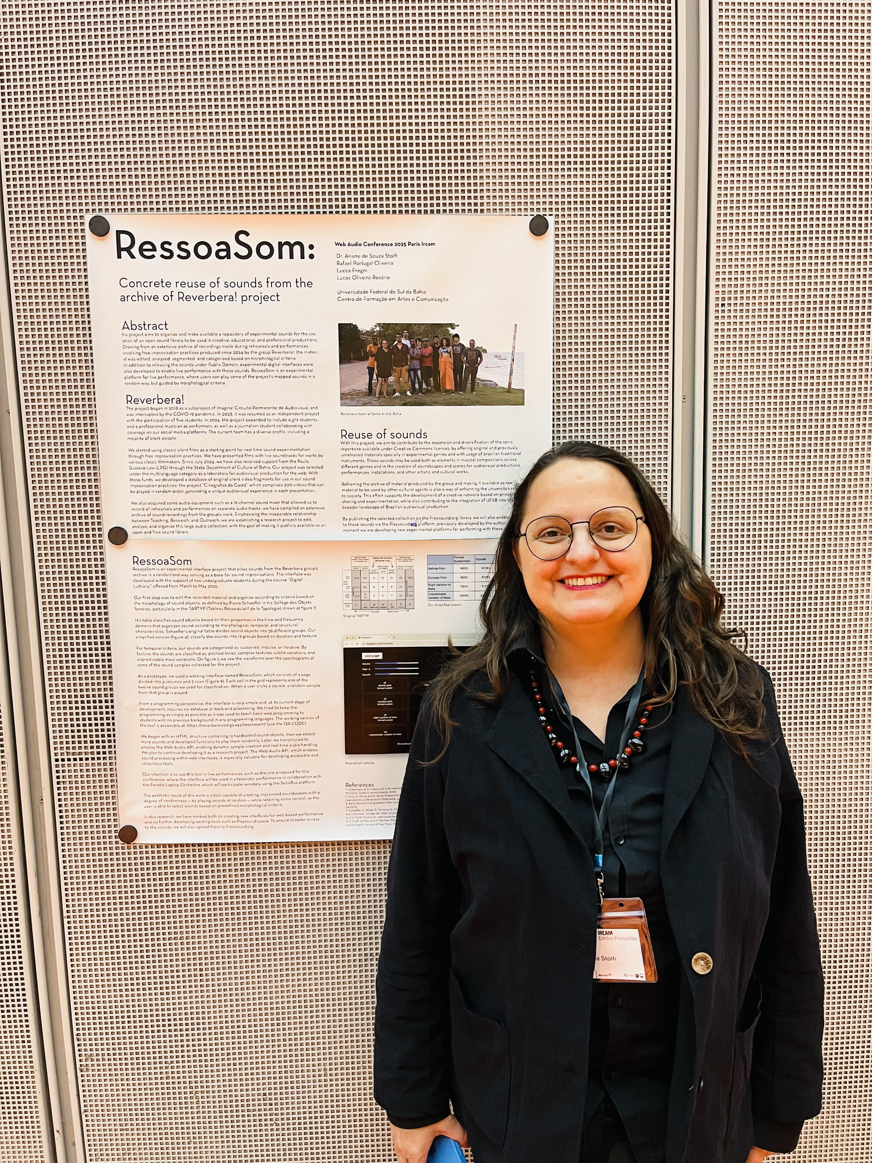 You can check the totally amazing collection of WAC2025 research papers on Zenodo (yep, free access and free download, as it should be!). The paper ‘RessoaSom: Concrete reuse of sounds from the archive of Reverbera! project‘, that Ariane presented as a research poster (and got the Best Poster Award for woohoo!!!), is also there. And just in case we didn’t make this clear, the Reverbera! project was the whole raison d’être for this particular FLO performance, as Ariane used the RessoaSom platform to perform, and Silvia constructed the visuals using the library of 200 videos filmed as part of the project! Nice!