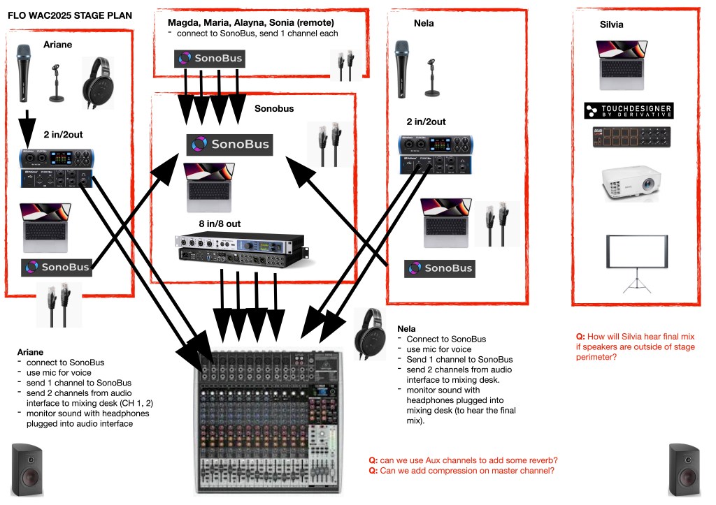 In our correspondence with the WAC2025 organisers, we worked out that we only had time to do a quick set-up and sound check on the day of the performance (as all the other performances and conference sessions were taking place in the same venue at IRCAM), so we sent the organisers a detailed stage plan with some additional questions for IRCAM technicians.