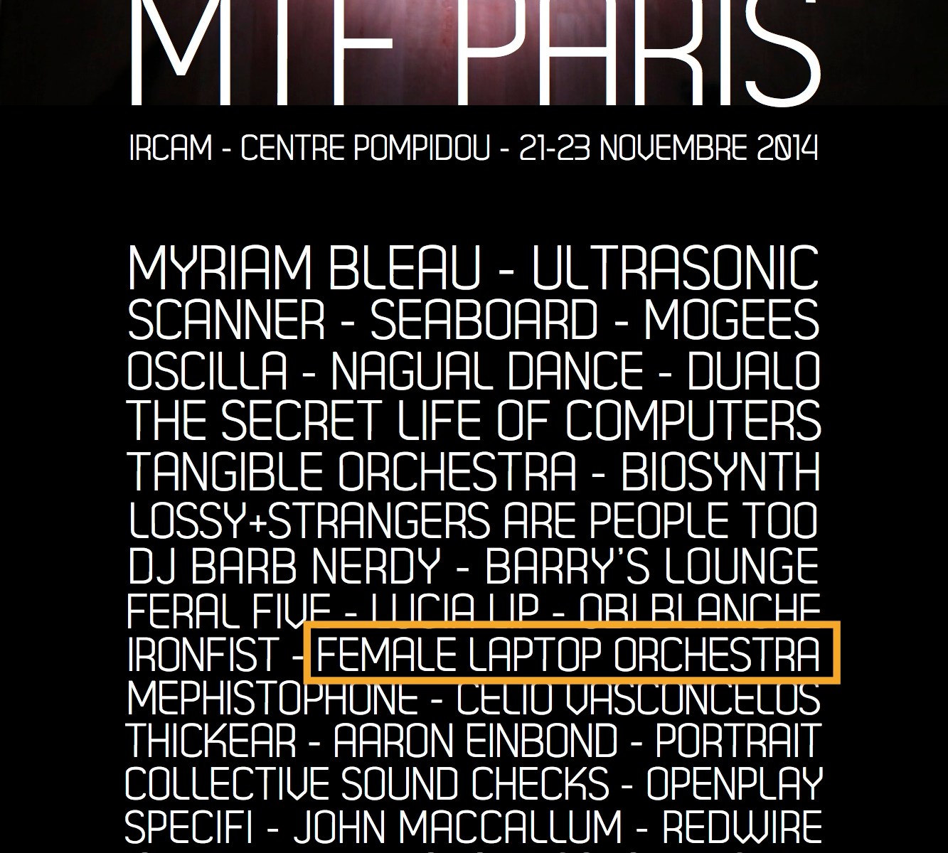 Female Laptop Orchestra (FLO) project was officially launched on 22 November as part of Music Tech Fest Paris, taking place at Centre Pompidou, the home of IRCAM. Nela presented the project to an audience of musicians, coders, scientists and researchers inviting them to make suggestions for remote audio-visual systems FLO could be using to rehearse, compose and perform. …
